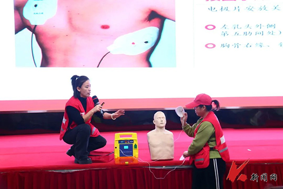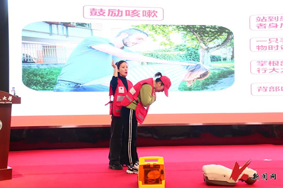 鞍山市紅十字會應急救護師劉亞納為同學們分別介紹了家庭中一些常見急癥,氣道異物梗阻以及心搏驟停等意外情況,并與紅十字會其他講師一同示范了背部叩擊法、腹部沖擊法,模擬演練了心肺復蘇,以及AED除顫儀的使用等急救手段。講師們和同學們分為4組進行了緊急救護實操演習,大家紛紛運用所學知識進行急救訓練。