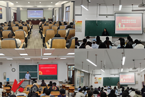 在班會中,學院黨委書記王曉建圍繞“校園交通安全”主題,從交通安全、人身安全、消防安全等方面向同學們講解了校園中存在的安全隱患,帶領學生深入學習《遼寧科技大學校園道路交通安全管理辦法》,強調校園電動車駕駛要控制車速、禮讓行人、不超載,必須到校園充電點進行充電,切勿將電源帶入室內或私扯電源。院長蔡麗華圍繞“營造文明校園氛圍,創造溫馨學習環境”主題,從職業生涯規劃角度切入,勉勵大家要端正專業學習態度,嚴肅考風考紀,積極參加學術競賽,提升自身綜合能力。她囑咐同學們要珍惜時間,努力提升專業水平,練就過硬本領,樹立階段目標和人生奮斗目標,爭取在大學期間取得優異成績。副院長石峰圍繞“迎接本科教育教學審核評估”主題,從審核評估的重要意義、審核評估知識、專業培養目標等方面對學生進行教育引導,向同學們闡述審核評估的重要意義和對學校師生的影響,帶領同學們深入學習《遼寧科技大學審核評估知識手冊》學生篇,介紹“跨境電商”方向的專業培養特色以及學院實習實踐基地建設情況,倡導同學們養成勤奮學習、嚴謹治學的良好習慣,為迎接審核評估營造良好的校園氛圍,共同推動學校教育教學質量的全面提升。副院長張晶薇圍繞“營造文明校園氛圍,創造溫馨學習環境”主題,從學生日常行為管理和學風建設兩個方面教育引導學生遵守課堂紀律,不遲到、不早退,課堂上專心學習,不做與課堂無關的事,在校期間要嚴格約束自己,舉止文明,言行得體。
