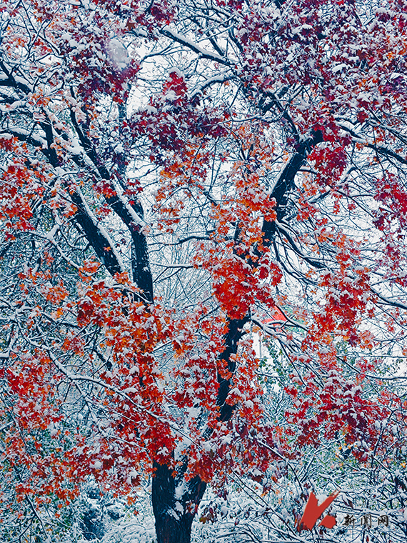 秋意還未完全退去,冬天終于在人們的期盼中姍姍來臨了。飄落的雪花中夾雜著片片金燦燦、火紅火紅的葉子,給白雪的畫布增添了繽紛的顏色,這個(gè)冬天更加別具一格。