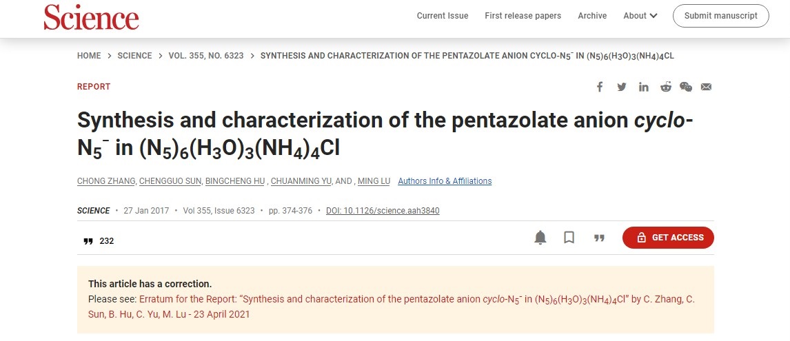 該論文闡述了世界上首次合成以5個氮原子組成的環(huán)狀陰離子化合物“pentazolate”(五唑陰離子)。由于該陰離子分解產物主要是氮氣且具有較大的生成焓,可以用于高密度能量材料和火箭的固體推進劑,一直是國內外含能材料領域比較關注的重點。但自1956年它的前驅體芳基五唑被首次合成以來,制備穩(wěn)定存在的五唑陰離子化合物一直沒有取得實質性進展。