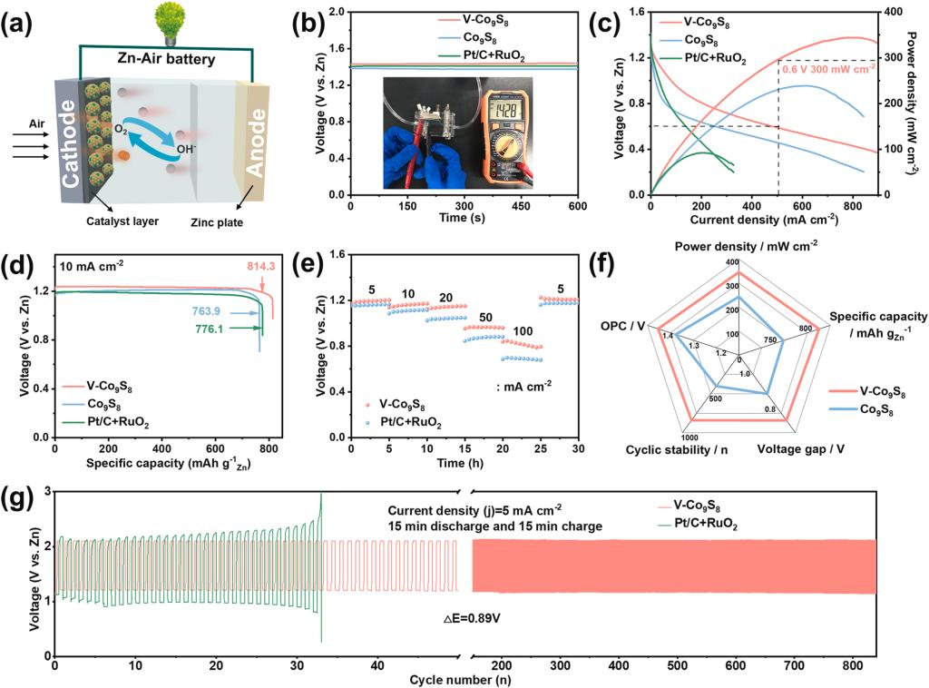 8納米粒子晶格中原子水平的釩摻雜,從而調(diào)控催化劑電子構(gòu)型(圖1)。研究發(fā)現(xiàn),適量的釩摻雜水平,即對催化劑電子結(jié)構(gòu)的溫和調(diào)控能夠優(yōu)化Co的自旋態(tài),平衡反應(yīng)過程中氧中間體的吸附/解吸,從而加速氧反應(yīng)動力學(圖2)。實驗研究證實,使用V-Co9S8作為空氣陰極催化劑組裝的鋅-空氣電池可提供超高功率密度(345 mW cm