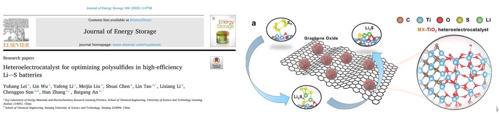 近日,我校化學工程學院遼寧省能源材料與電化學重點實驗室安百鋼教授團隊的研究成果《Heteroelectrocatalyst for optimizing polysulfides in high-efficiency Li-S batteries》在《Journal of Energy Storage》上在線發表。論文第一作者為我校2022級碩士研究生雷宇航,導師張涵副教授為通訊作者,安百鋼教授和陶林老師為共同通訊作者。該項研究工作得到了國家自然科學基金項目、省重點攻關項目和遼寧省能源材料與電化學重點實驗室的大力支持。