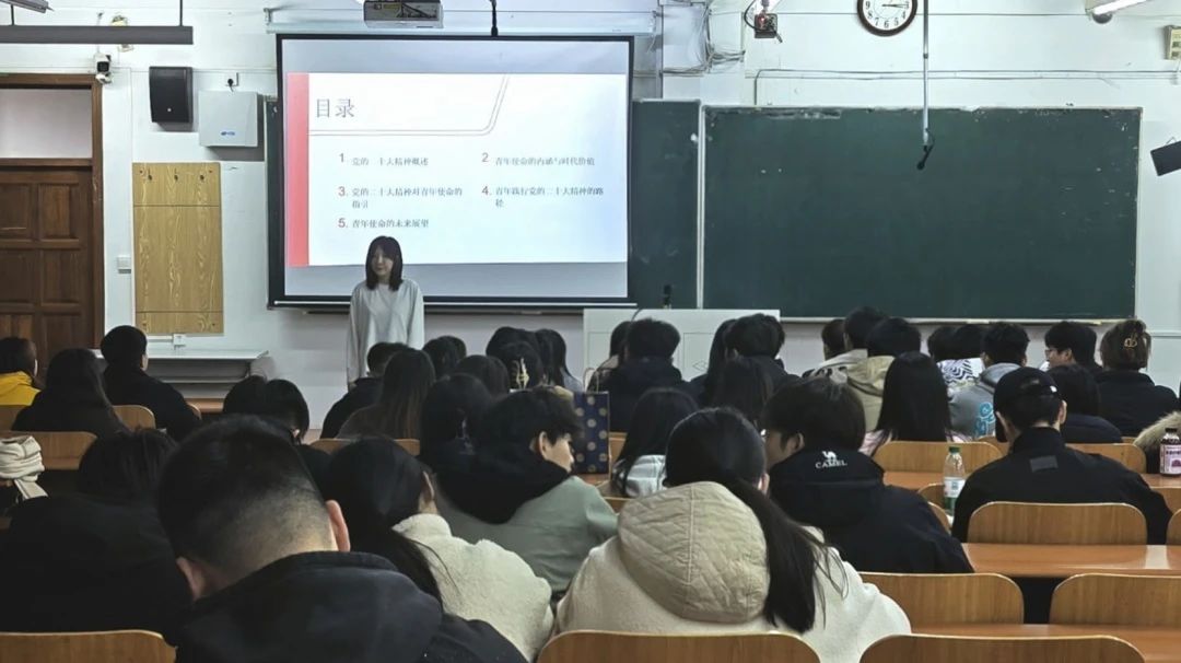 團課上,丁一卓以近期社會熱點為切入點,帶領同學們深入學習黨的二十大報告。她從“青年群體在科技創新前沿的突破”“鄉村振興中大學生村官的擔當”“基層治理中青年志愿者的奉獻”等案例出發,結合報告中“全黨要把青年工作作為戰略性工作來抓”的論述,生動展現了新時代十年間青年群體在國家發展中的重要作用。她特別解讀了報告中“廣大青年要立志做有理想、敢擔當、能吃苦、肯奮斗的新時代好青年”的核心要求,讓同學們對自身的時代使命有了更為清晰、深刻的認識,筑牢了后續學習交流的思想根基。