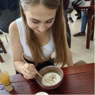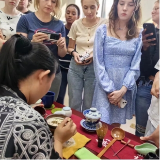 在認真觀看學習了選茶、燒水、溫壺、置茶到點湯、分茶等一系列茶藝流程后,同學們在專業老師的指導下紛紛動手嘗試點茶。他們拿起茶筅,在茶碗中攪拌茶湯,體驗著中國茶文化的獨特韻味。來自俄羅斯的如雪同學說:“我很喜歡中國茶。中國茶道強調靜心、修身,在制茶的過程中,我能夠感受到內心的寧靜和放松。”