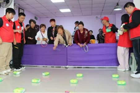 講座結束后,志愿者們與社區老人們一起體驗了“趣套重陽,笑滿社區”的套圈趣味游戲。活動現場氣氛熱烈,老人們在志愿者的帶領下,積極參與其中,歡聲笑語不斷。通過活動,老人們不僅感受到了節日的歡樂氣氛,鍛煉了身體,還加強了社區內的交流與互動,增進了鄰里間的感情。