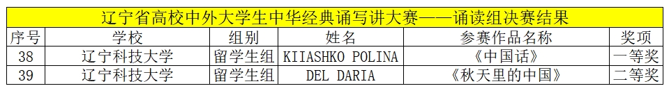 本屆大賽由遼寧省教育廳主辦、遼寧師范大學承辦,共吸引了全省49所高校1219名選手或團隊參賽。經過初賽和復賽的激烈角逐,留學生KIIASHKO POLINA和DEL DARIA進入決賽。KIIASHKO POLINA朗誦作品《中國話》榮獲詩詞誦讀大賽一等獎,DEL DARIA朗誦作品《秋天里的中國》榮獲詩詞誦讀大賽二等獎。