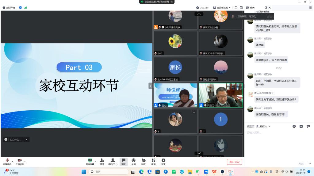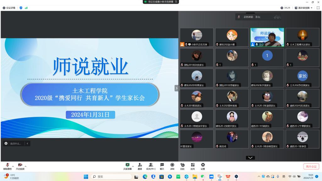 2月1日,遼寧科技大學(xué)土木工程學(xué)院“家校共育,共促就業(yè)”家長(zhǎng)會(huì)于線(xiàn)上召開(kāi),學(xué)院院長(zhǎng)周衛(wèi)紅教授應(yīng)邀出席并圍繞職業(yè)生涯規(guī)劃和就業(yè)指導(dǎo)等內(nèi)容展開(kāi)宣講,2024屆畢業(yè)班輔導(dǎo)員、全體畢業(yè)生及家長(zhǎng)參加會(huì)議。