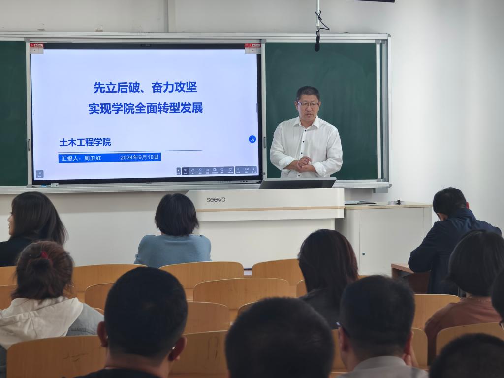 9月18日,土木學院在土木樓A508召開全院大會,布置學院“本科教學質量文化月”、“教師課堂教學大練兵”、期初教學工作例會等工作,進一步明確責任部門、責任人、截止時間等。會議要求全體教師務必按時完成每個階段任務,務必自檢互查到位。院長周衛紅總結了上半年重點工作目標完成情況,要求全體師生員工要同心協力,高質量完成學校的重點工作目標和審核評估工作。院黨委書記周曉平強調,黨建工作與審核評估工作要密切結合,黨員要發揮模范帶頭作用,在各自崗位沖在一線,勇擔重任,每位教師要積極工作,自覺遵守職業道德規范和工作紀律,確保各項工作順利完成。