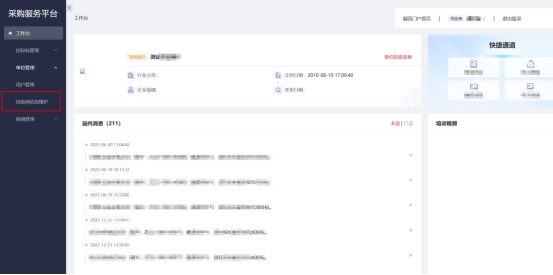 供應商登錄系統后,進入工作區,點擊左側“單位管理”下“供應商信息維護”菜單, 進入供應商信息維護的頁面,請根據單位實際情況填寫信息,提交即完成信息的維護(成為正式供應商)。