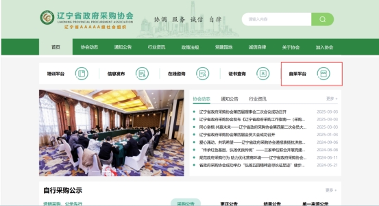 瀏覽器搜索遼寧省政府采購協會(或瀏覽器直接輸入網址:http://www.lngpa.cn/#/)并打開網站首頁,點擊右上角【自采平臺】,進入登錄頁。